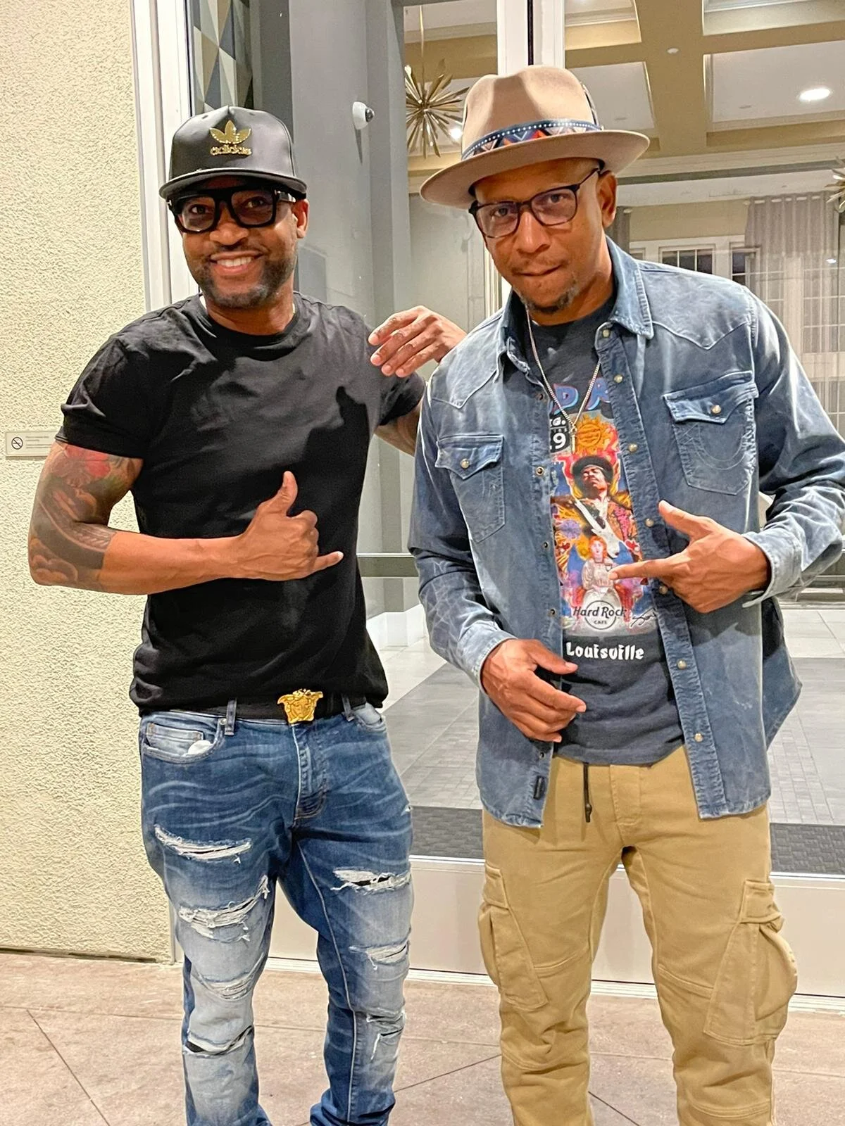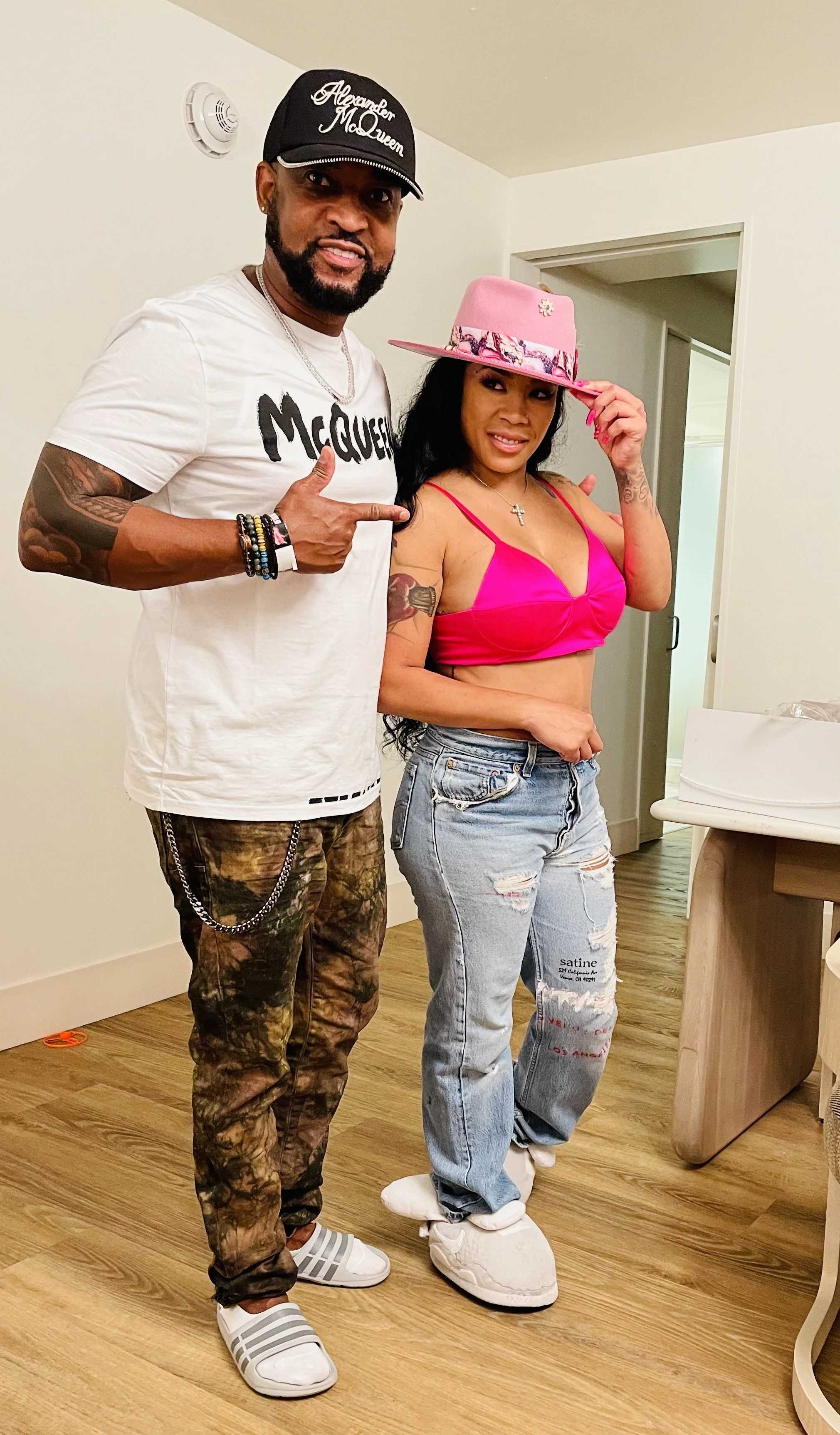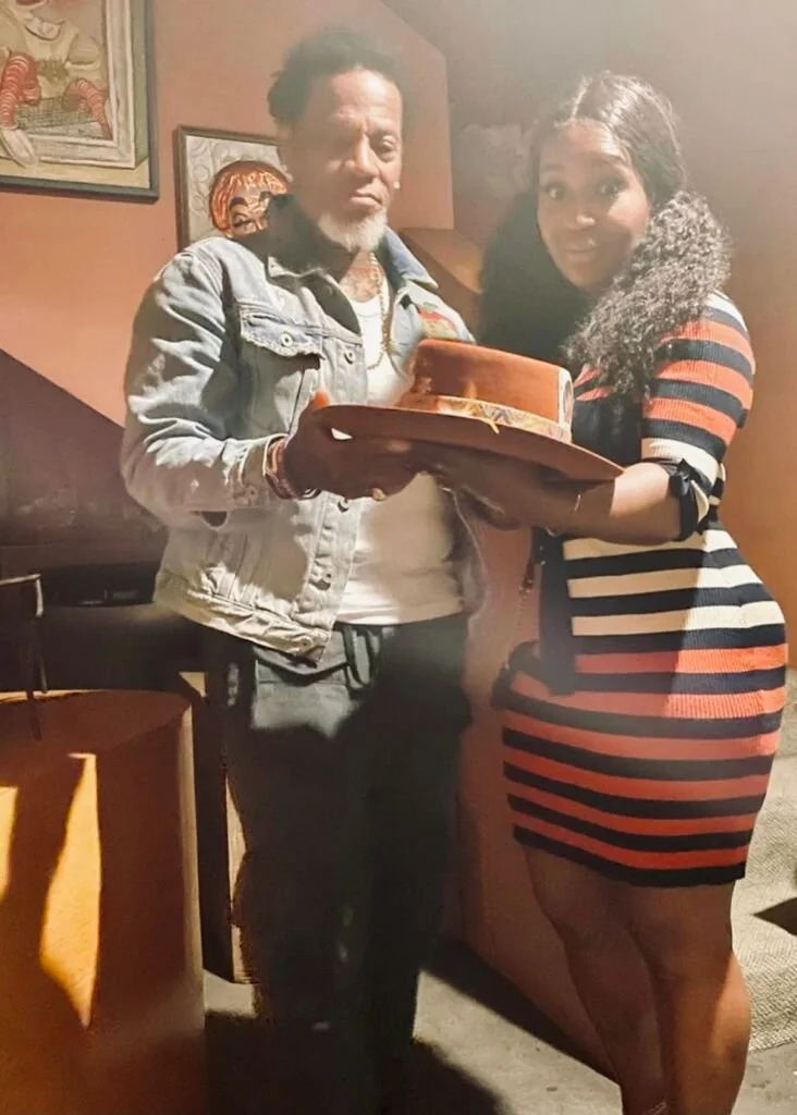 Actor/ Comedian DL Hughley and Comedian/ Radio Personality Mz Sharelle holding a KurtzTrends Fedora piece